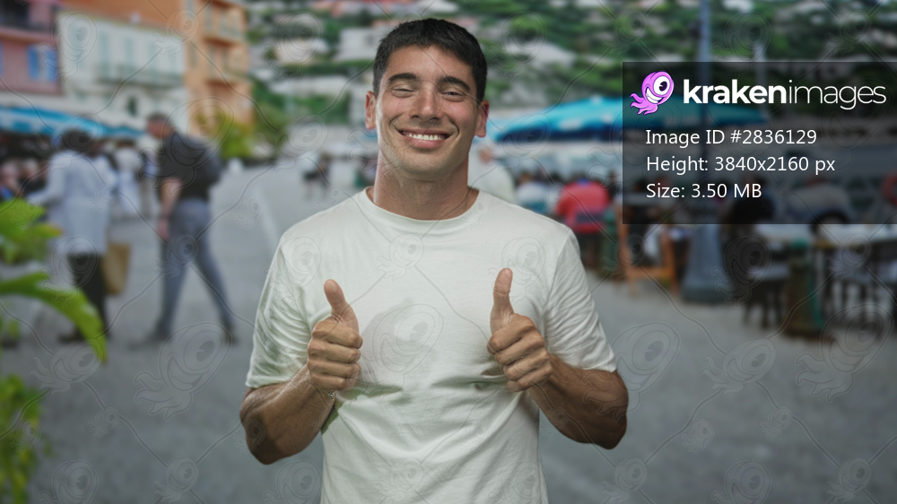 Young hispanic man wearing a white t-shirt gives double thumbs up on an outdoor restaurant terrace; optimism.