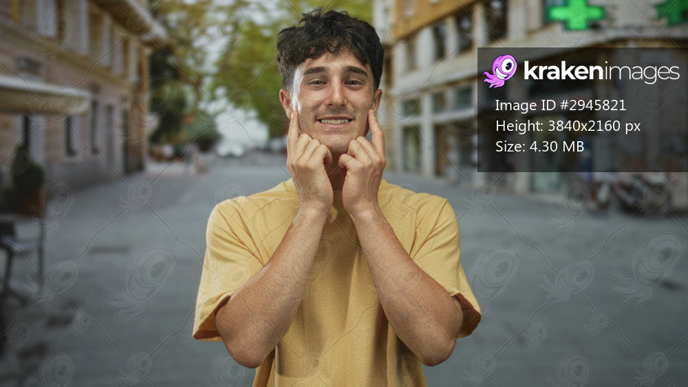 Young hispanic man wearing a yellow t shirt pointing index fingers to his cheeks on a city street; cheerful confidence.