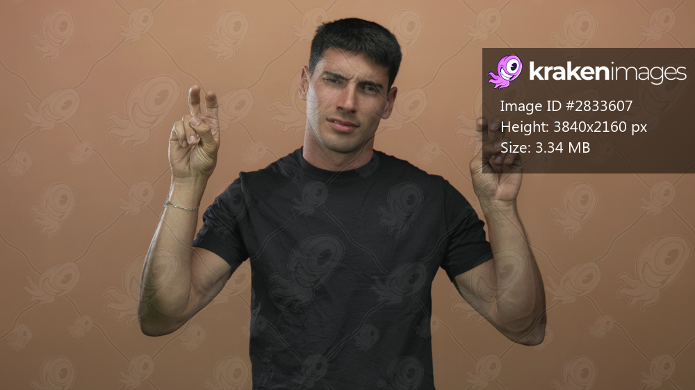 Young hispanic man wearing black shirt making air quotes with fingers in studio with skeptical expression; sarcasm.