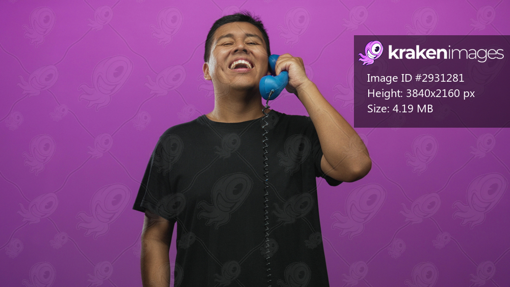 Young hispanic man wearing black t shirt holding bright blue telephone handset to ear, eyes closed singing in purple studio; playful mood.