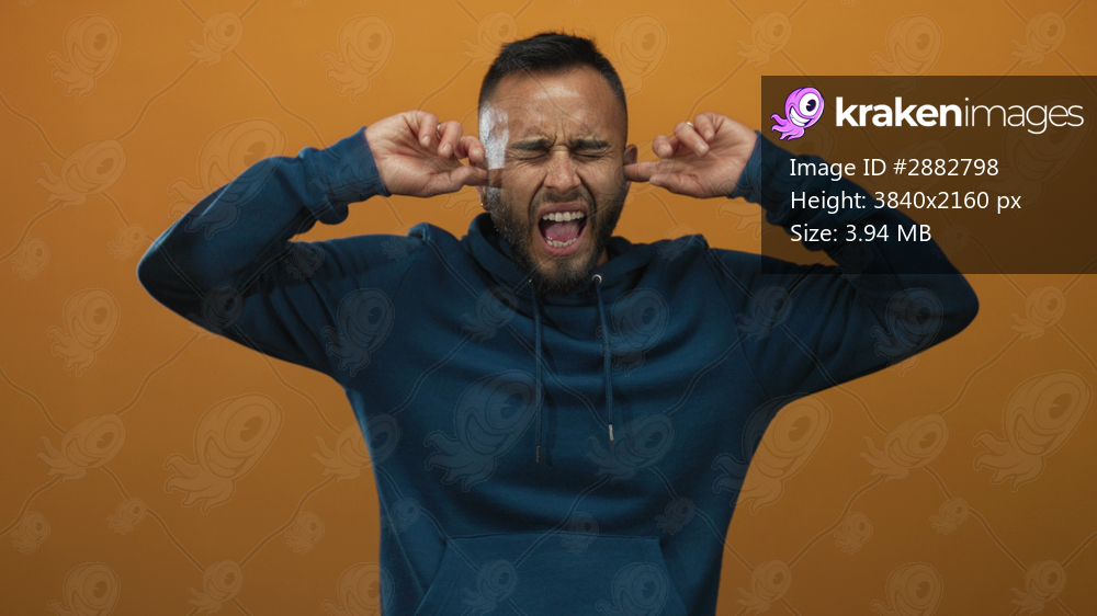 Young hispanic man wearing blue drawstring hoodie and gold earring covering ears with fingers in orange studio; frustration.