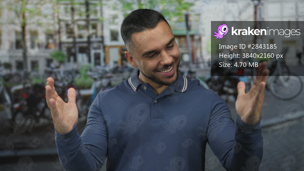 Young hispanic man wearing blue polo shirt smiles and spreads hands wide by bike parking on street; friendly enthusiasm.