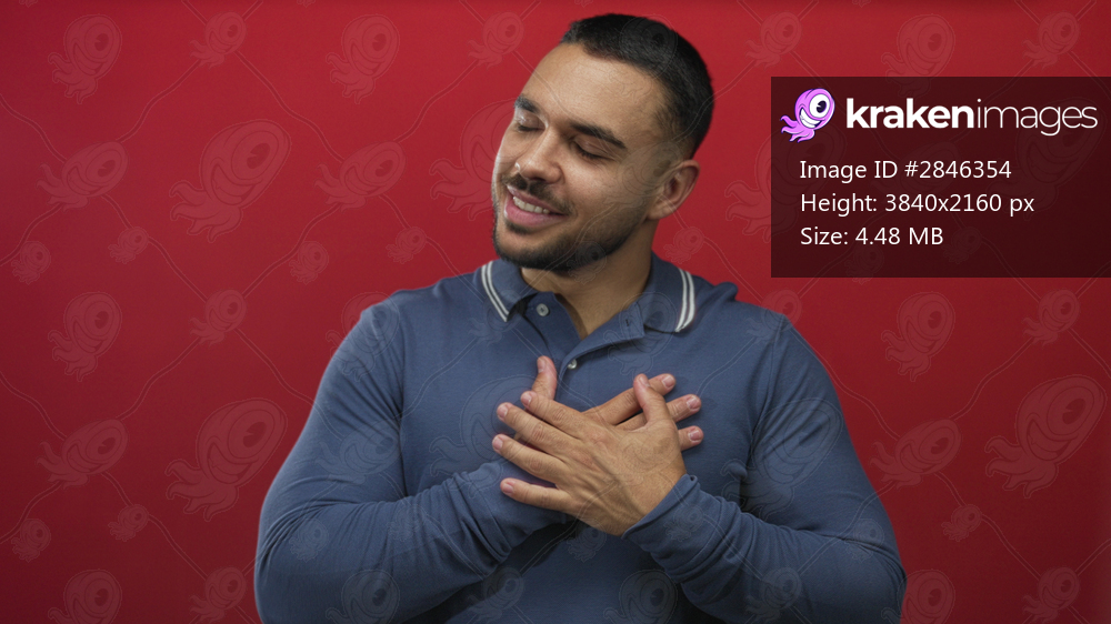 Young hispanic man wearing blue polo shirt smiling and warmly clutching chest in red studio; gratitude.