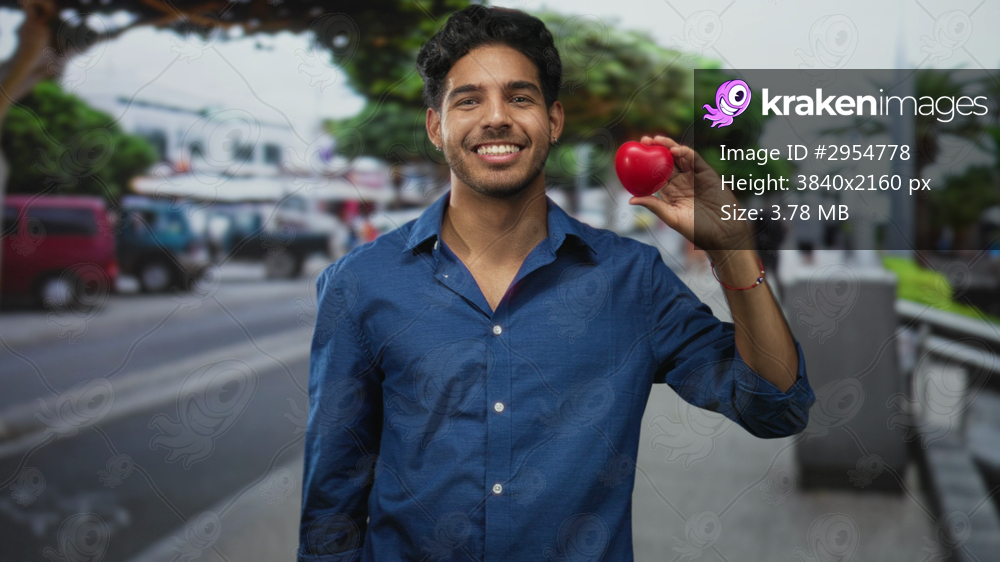 Young hispanic man wearing blue shirt holds small red heart and forms heart with hands on street; love joy warmth.