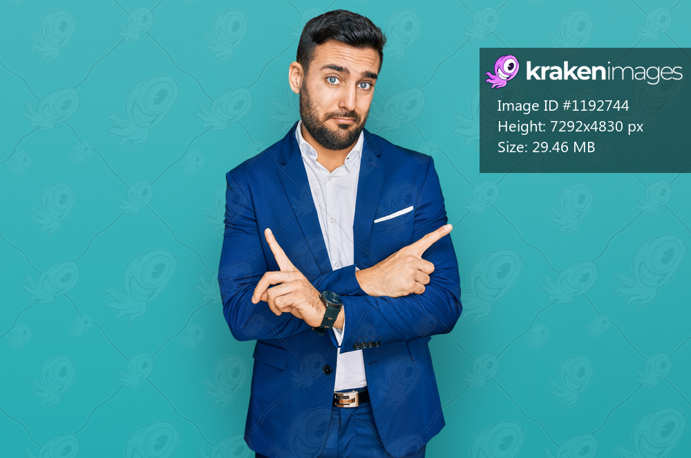 Young hispanic man wearing business jacket pointing to both sides with fingers, different direction disagree