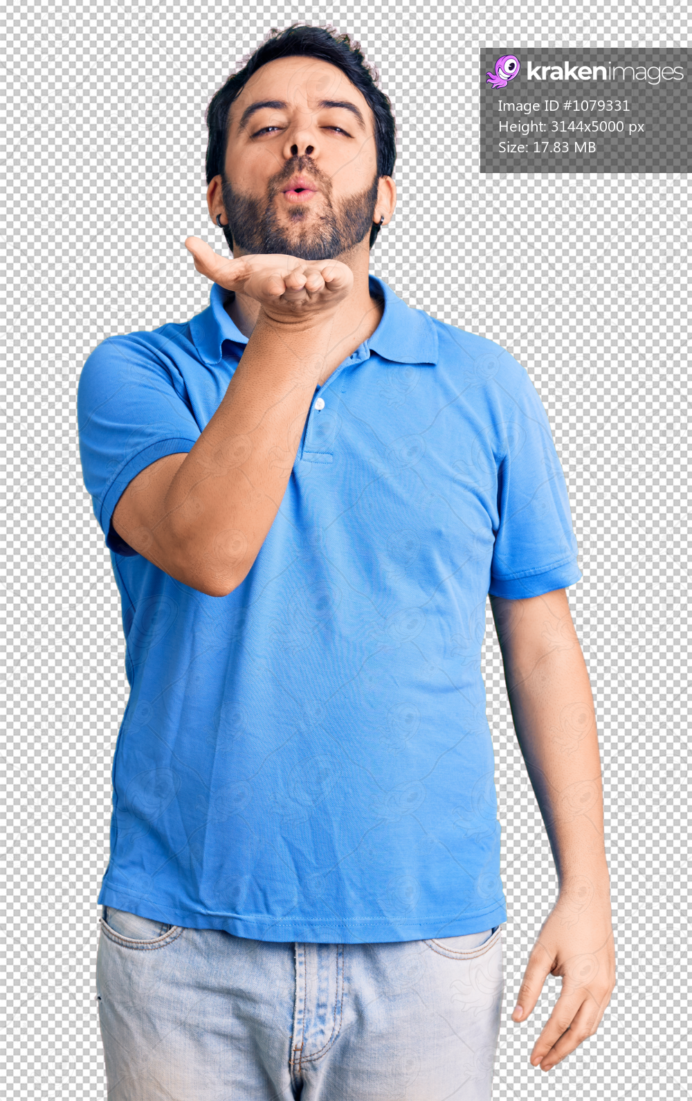 Young hispanic man wearing casual clothes looking at the camera blowing a kiss with hand on air being lovely and sexy. love expression.