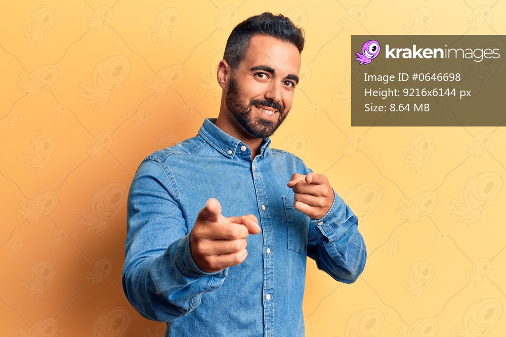 Young hispanic man wearing casual clothes pointing fingers to camera with happy and funny face. good energy and vibes.