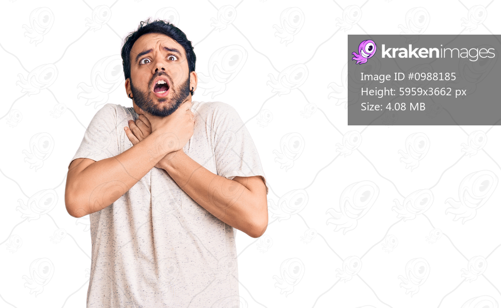 Young hispanic man wearing casual clothes shouting and suffocate because painful strangle. health problem. asphyxiate and suicide concept.