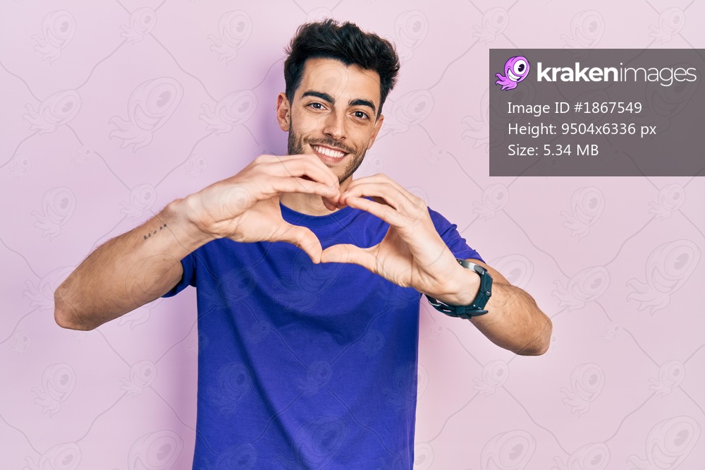 Young hispanic man wearing casual t shirt smiling in love doing heart symbol shape with hands. romantic concept.