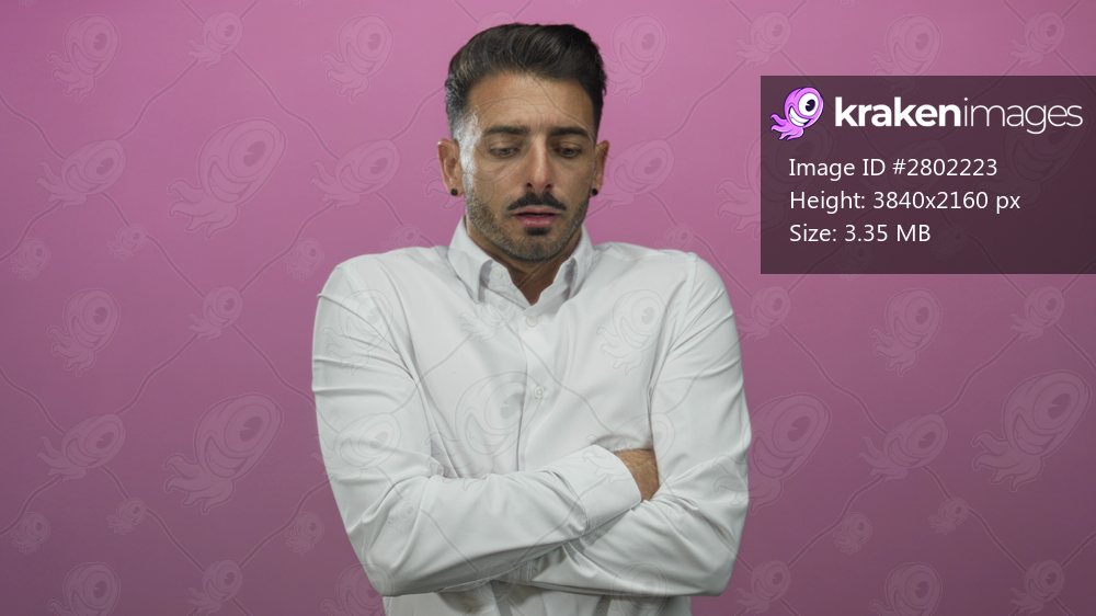 Young hispanic man wearing crisp white shirt crossing arms against a pink studio backdrop; rejection doubt.