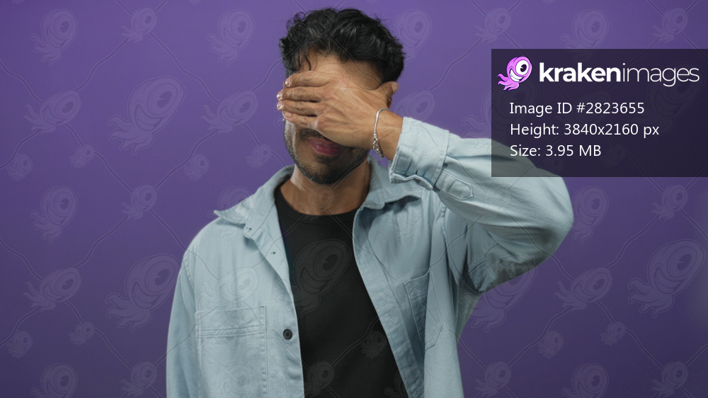 Young hispanic man wearing denim shirt covers eyes with raised hand in studio against purple background; introspection.