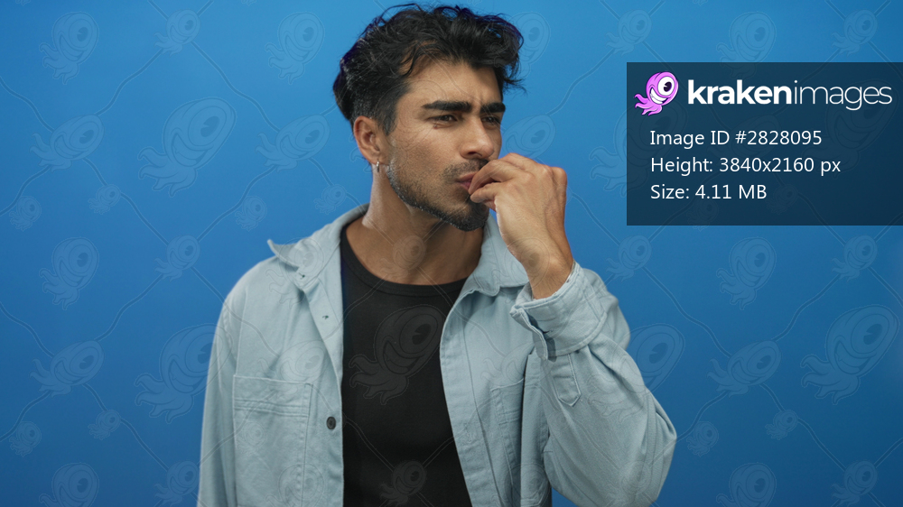 Young hispanic man wearing denim shirt makes pinch gesture with fingers near lips in blue studio; satisfaction joy pleasure delight.