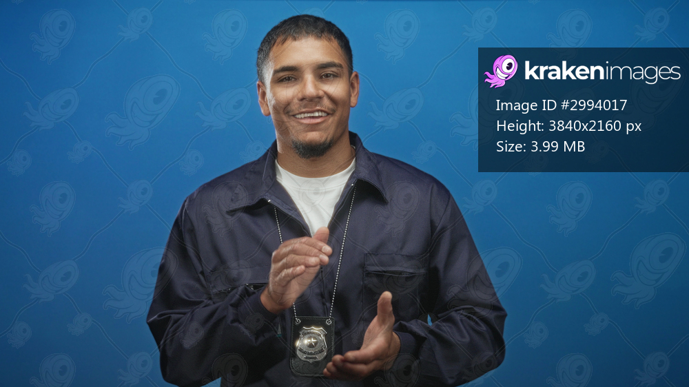 Young hispanic man wearing detective badge and navy jacket rubbing and clasping hands while smiling in studio; confidence readiness.