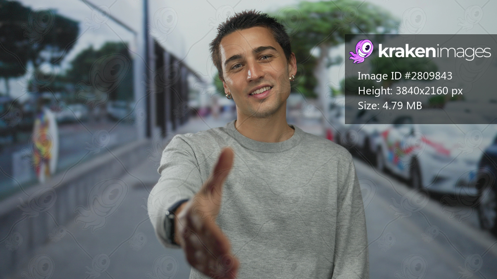Young hispanic man wearing earrings extends his hand for a handshake on an urban street with cars and trees, conveying friendliness and connection in a city environment. - Kraken Images