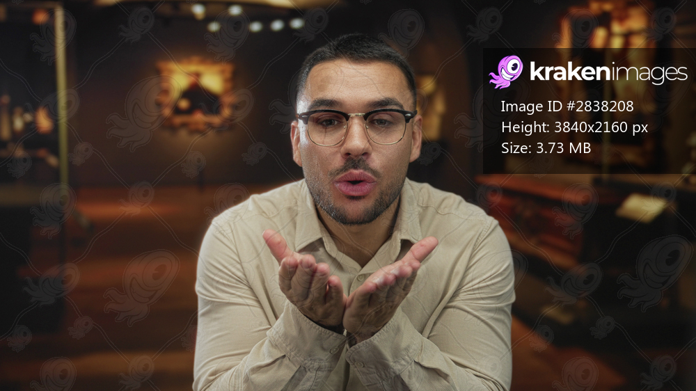 Young hispanic man wearing glasses and a beige shirt holds hands cupped blowing kiss in gallery building; affection.