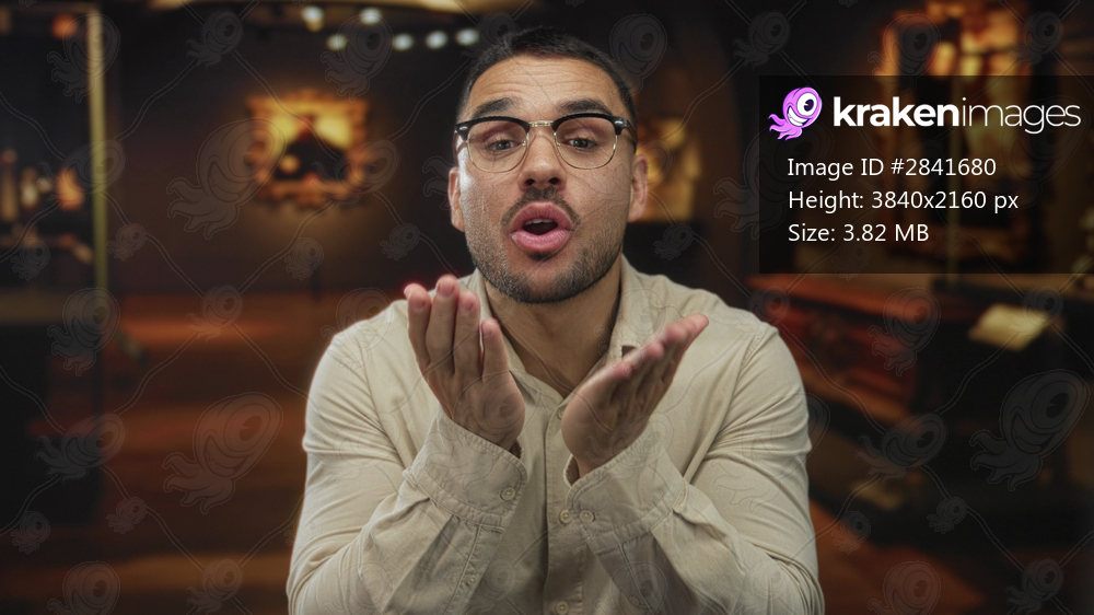 Young hispanic man wearing glasses and a beige shirt holds hands cupped blowing kiss in gallery building; affection.