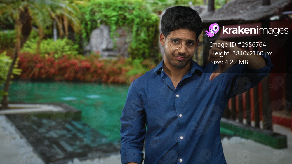 Young hispanic man wearing glasses and a blue shirt giving thumbs down by a poolside wooden building at a resort; disapproval.