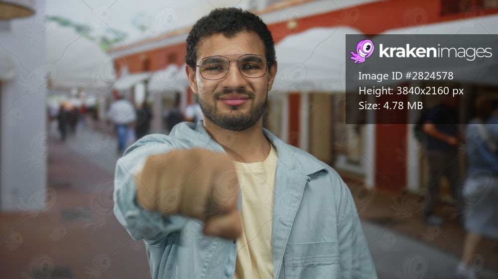 Young hispanic man wearing glasses and a light denim jacket stands smiling at camera on a street lined with awnings; confidence.