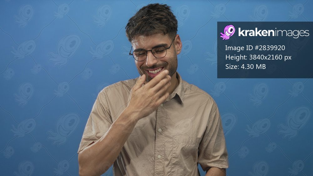 Young hispanic man wearing glasses and beige shirt clutch chest with both hands in bright blue studio; gratitude.