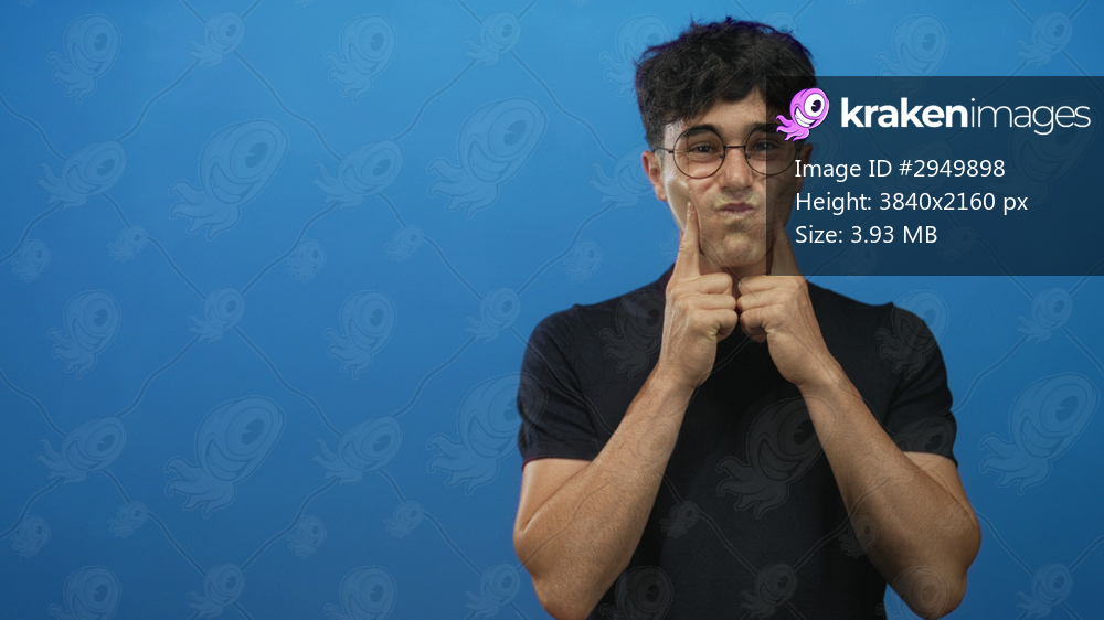 Young hispanic man wearing glasses and black t shirt presses cheeks and puffs mouth in blue studio; playful humor.