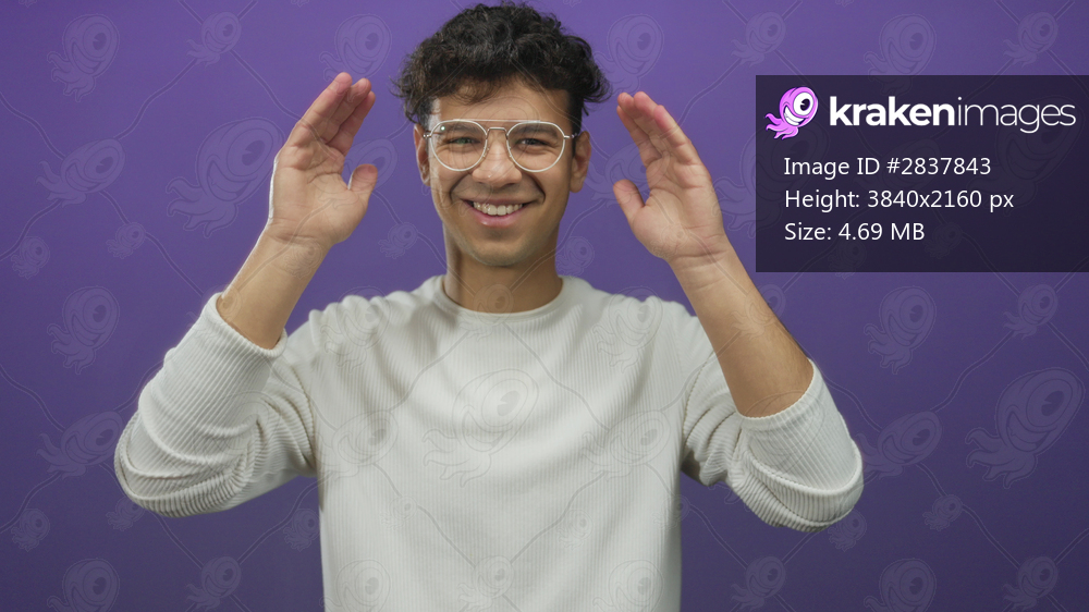 Young hispanic man wearing glasses casually covers face with hands and smiles in a purple studio; shyness.