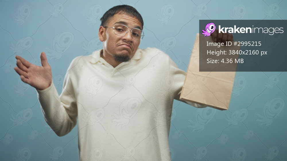 Young hispanic man wearing glasses and cream sweater holding a crumpled paper bag while shrugging with hands in studio; uncertainty.