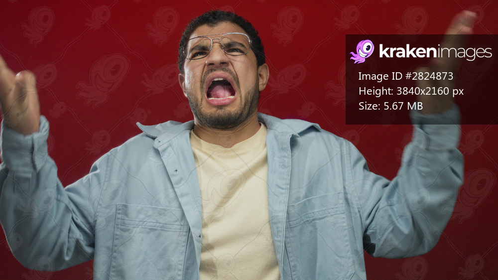 Young hispanic man wearing glasses and denim shirt points finger with open mouth in studio; anger frustration.