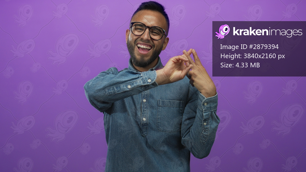 Young hispanic man wearing glasses and denim shirt showing hands making peace sign and smiling in a purple studio; joyful celebration.