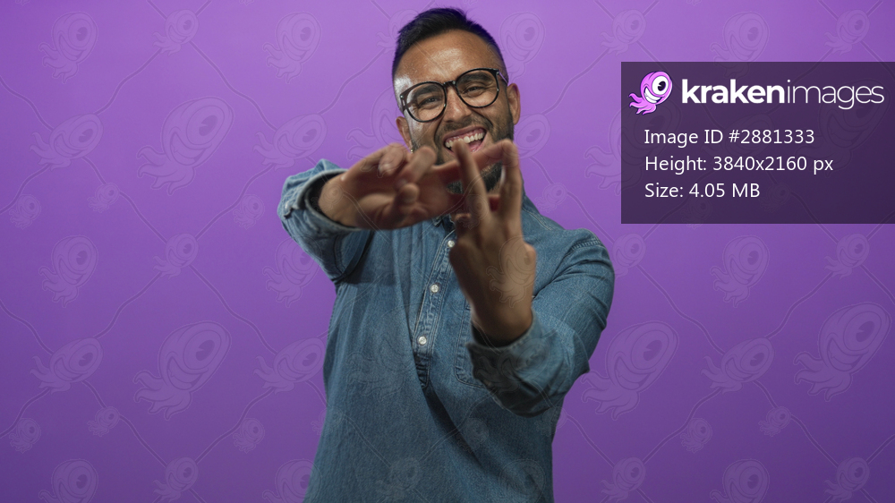 Young hispanic man wearing glasses and denim shirt showing hands making peace sign and smiling in a purple studio; joyful celebration.