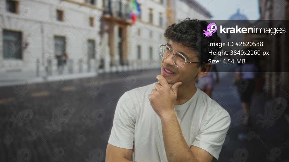 Young hispanic man wearing glasses hand on chin thinking on sunlit cobblestone street in historic city center; curiosity.