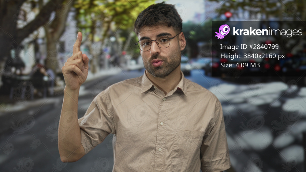Young hispanic man wearing glasses holding victory gesture with two fingers on busy city street; peace.