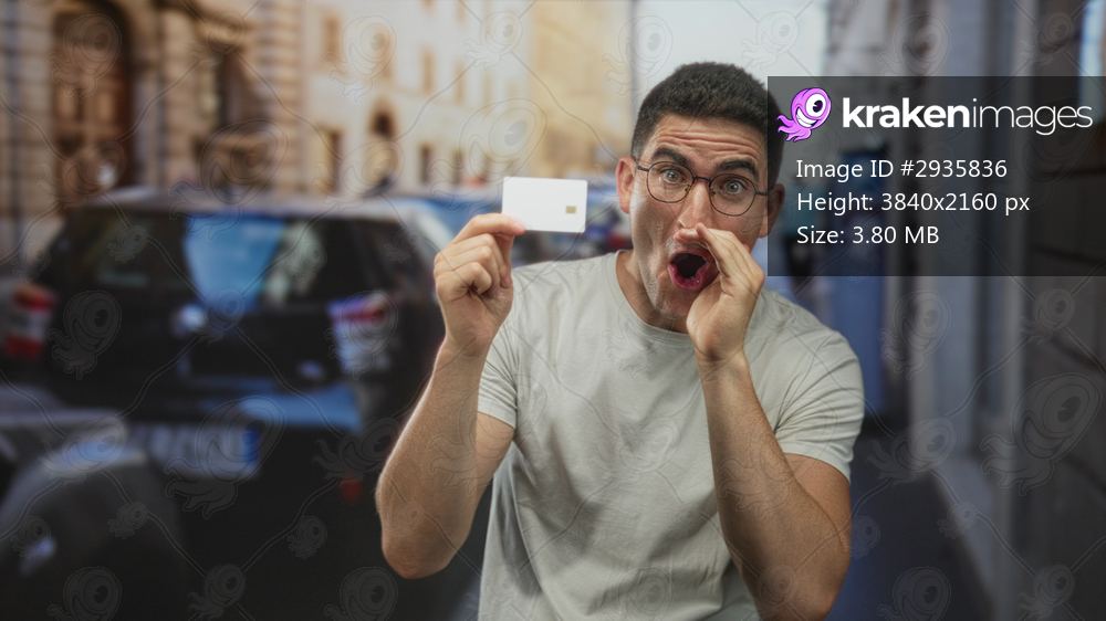 Young hispanic man wearing glasses holds a credit card and pinches nose on a busy street sidewalk; disgust smell.
