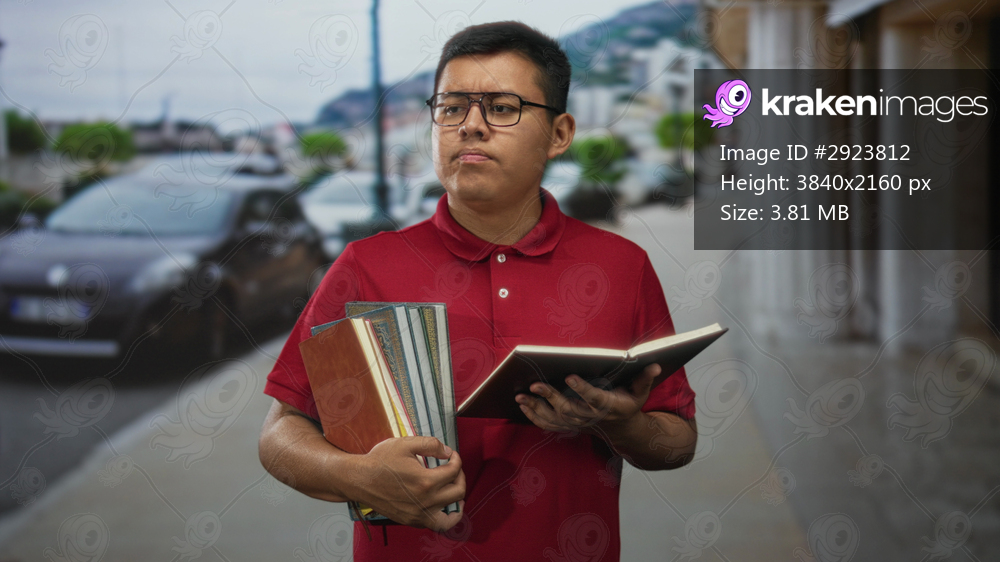 Young hispanic man wearing glasses holds an open book and a stack of textbooks while reading with a puzzled expression on a city street near parked cars; confusion. - Kraken Images