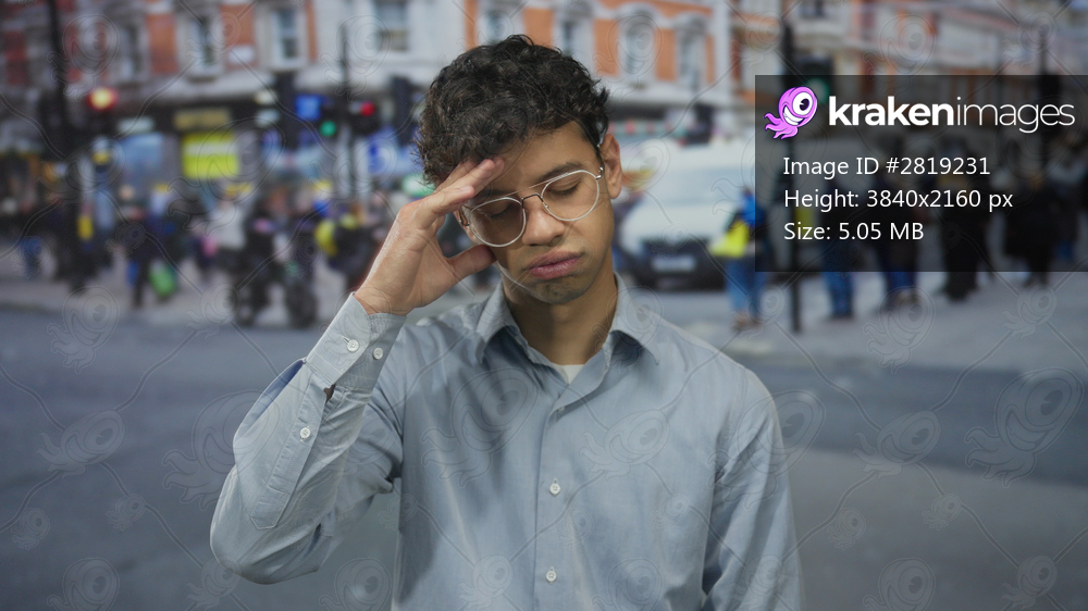 Young hispanic man wearing glasses holds temple on busy city street with blurred traffic; stress and fatigue.