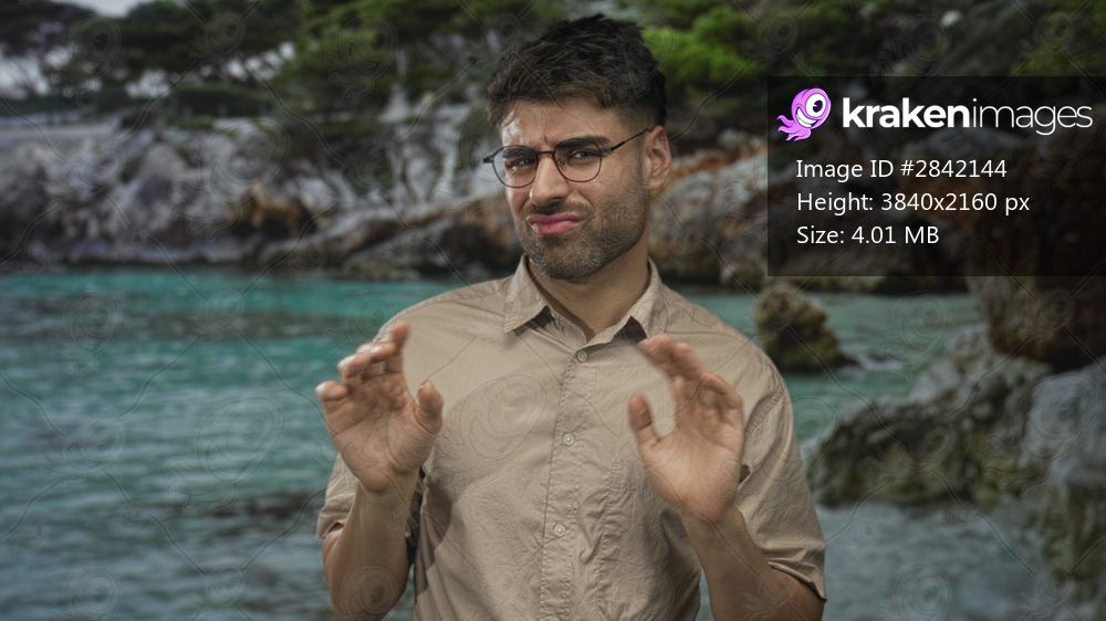 Young hispanic man wearing glasses in beige shirt holds hands raised by rocky shore in forest; disgust.