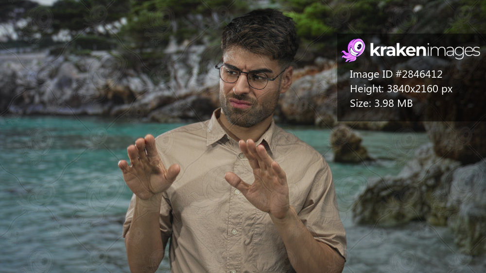 Young hispanic man wearing glasses in beige shirt holds hands raised by rocky shore in forest; disgust.