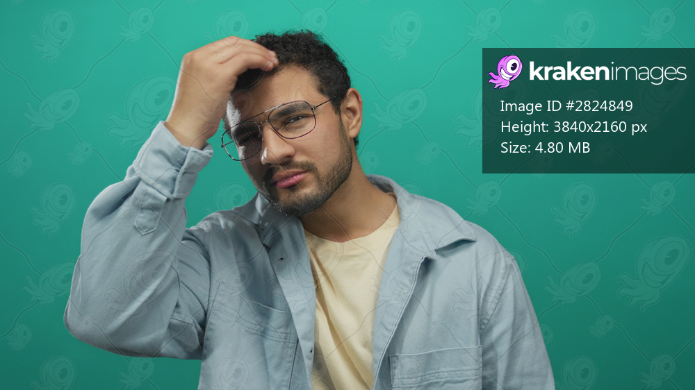 Young hispanic man wearing glasses in casual shirt touches head with hand in studio on green backdrop; confusion self reflection.