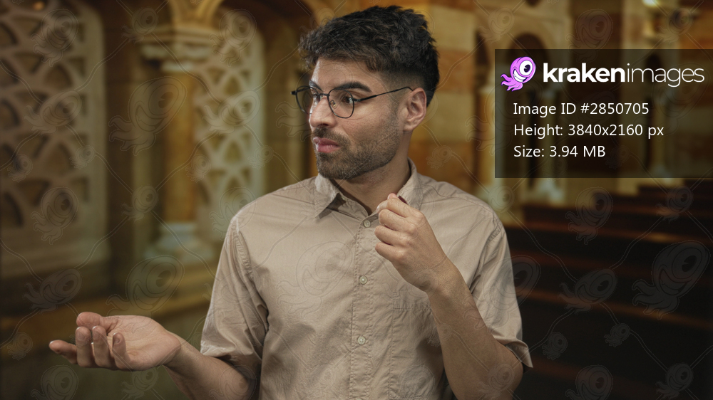 Young hispanic man wearing glasses pinches nose in church aisle under stone arches illuminated by sunlight; disgust.