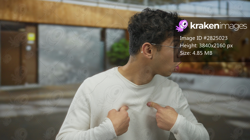 Young hispanic man wearing glasses points finger to chest in building entrance outdoors setting; confusion.