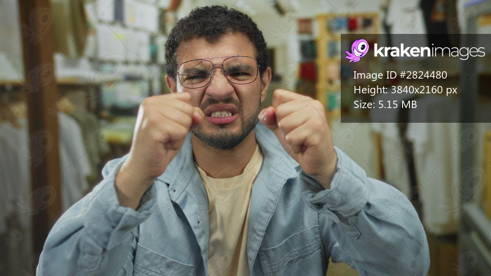 Young hispanic man wearing glasses pressing temples with hands amid clothing racks in retail building; frustration.