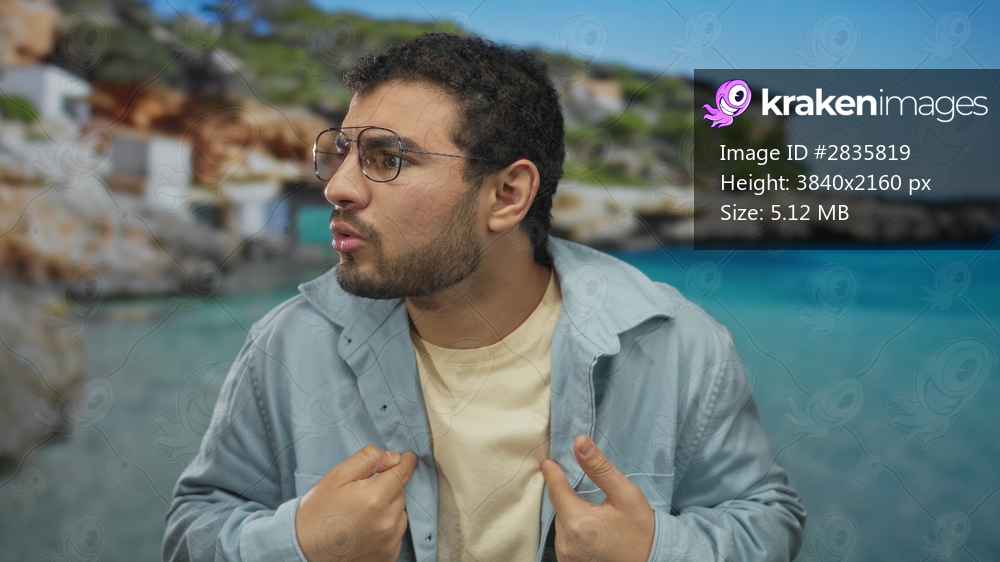Young hispanic man wearing glasses with raised eyebrows and open mouth grasps denim shirt collar at sunny rocky beach; surprise.