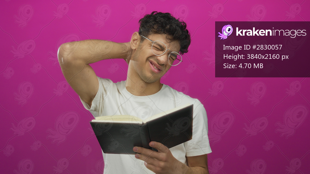 Young hispanic man wearing glasses reading book in studio scratches neck against pink wall; confusion.