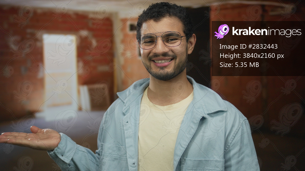 Young hispanic man wearing glasses smiles and shows open palm inside building under construction; optimism.
