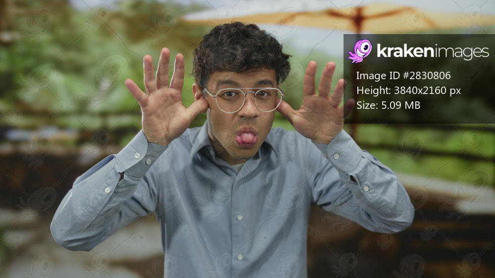Young hispanic man wearing glasses sticks tongue out and raises hands in green forest clearing under leafy canopy; playfulness.