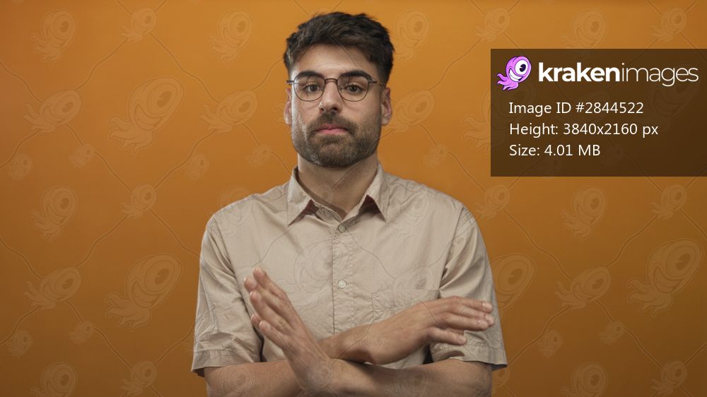 Young hispanic man wearing glasses tilting head and crossing arms looking at camera in studio; rejection.