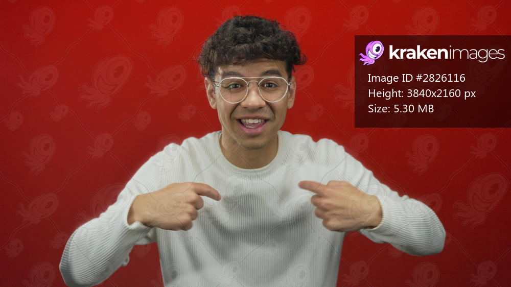 Young hispanic man wearing glasses waves both hands in red studio; friendly warm welcome connection.