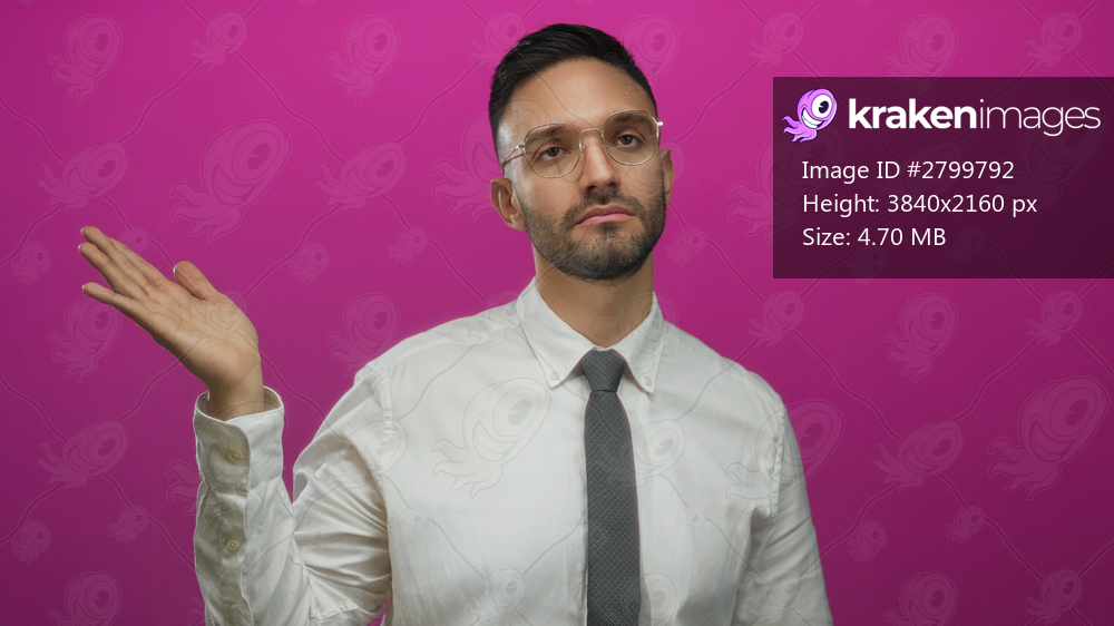 Young hispanic man wearing glasses and white shirt gestures dismissively against vibrant pink background