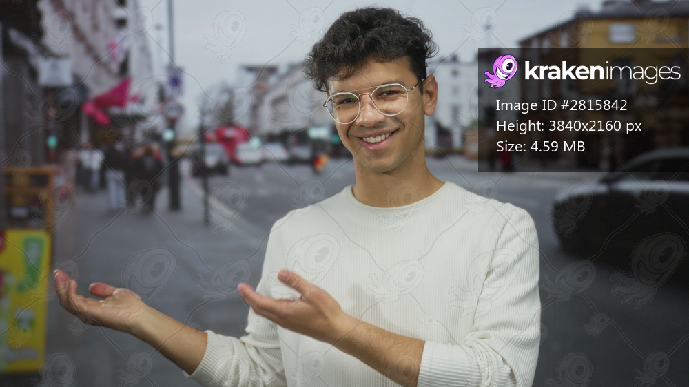 Young hispanic man wearing glasses and white sweater smiling with hand showing thumbs up on city street; approval.