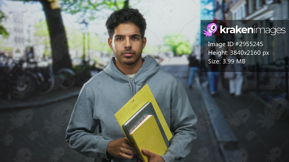 Young hispanic man wearing gray hoodie holding yellow notebooks and raising palm to block a camera on a busy street; guarded privacy.