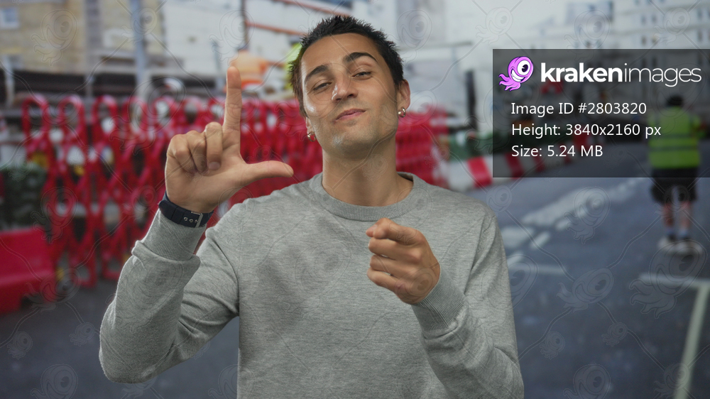 Young hispanic man wearing gray sweater showing loser sign and pointing finger at camera on street; teasing.
